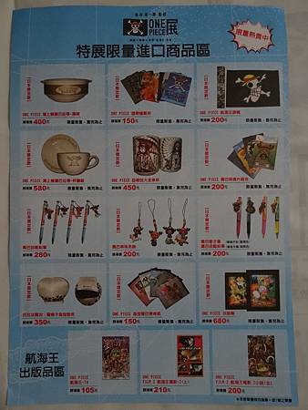 週邊部份只在本店買了『ONE PIECE展台灣官方導覽手冊 体感-ADVENTURE LOG-探險日誌』及『明信片(彩圖系列)』兩種,雖然展場內禁止拍照,但內容都收錄在導覽手冊中,東京展的場刊也有賣,,看了兩本樣書後發現台灣vs東京的規模果然有差,有不少等身大的人物展示沒有在台灣展出現,好可惜。